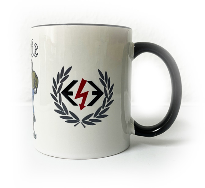 Aussen weiss - innen schwarz Keramikbecher, bedruckt mit Sublimation. 350 ml Fassungsvermögen. Mikrowellenfest.